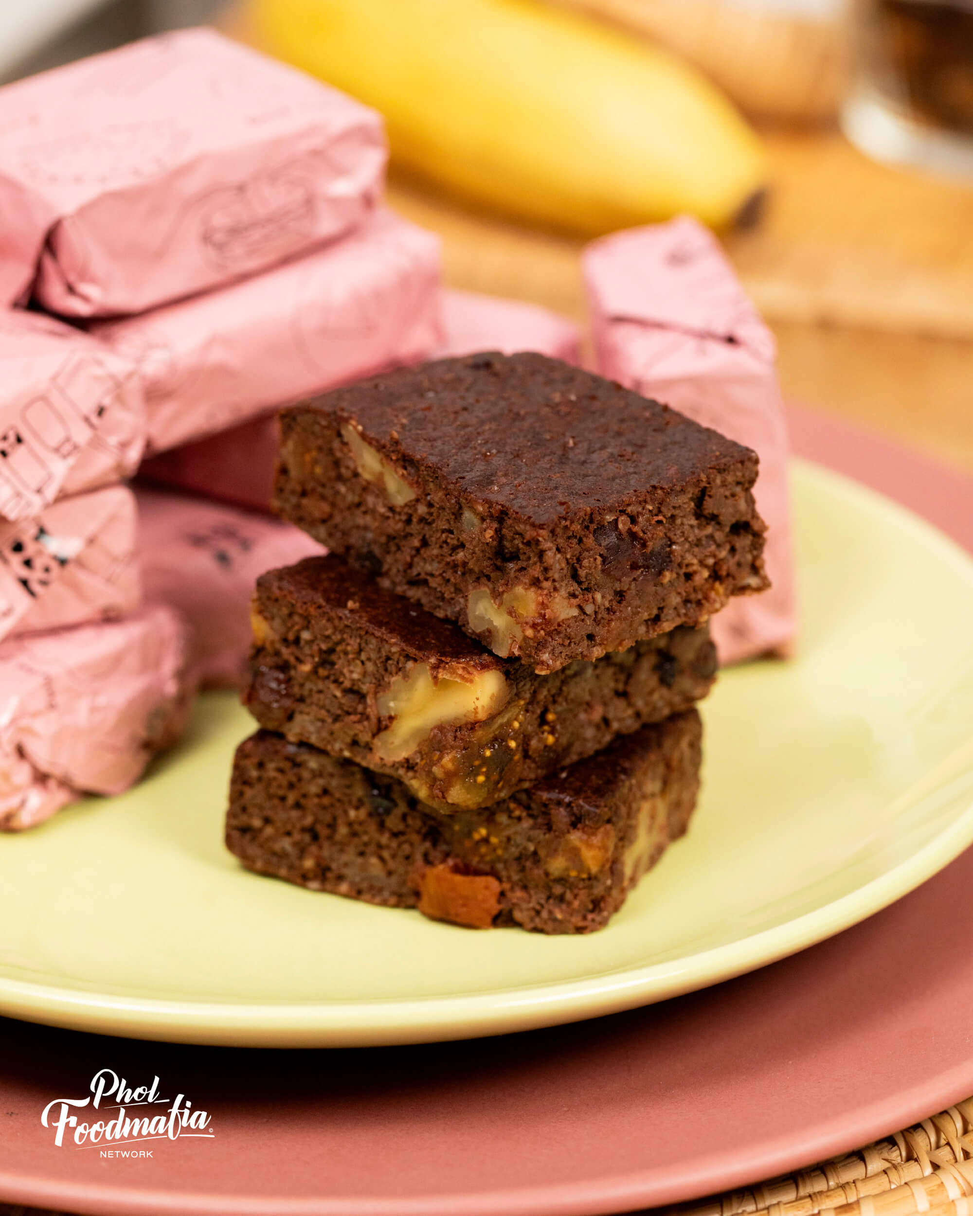 บราวนี่สูตรนี้ใช้ผงโกโก้ธรรมชาติที่มีรสเปรี้ยวอ่อน ๆ หวานอ่อน ๆ จากน้ำผึ้ง ไม่มีส่วนประกอบของแป้งสาลี สอดแทรกด้วยผลไม้แห้งหลากหลาย เพิ่มความกรุบกรอบด้วยถั่ววอลนัท