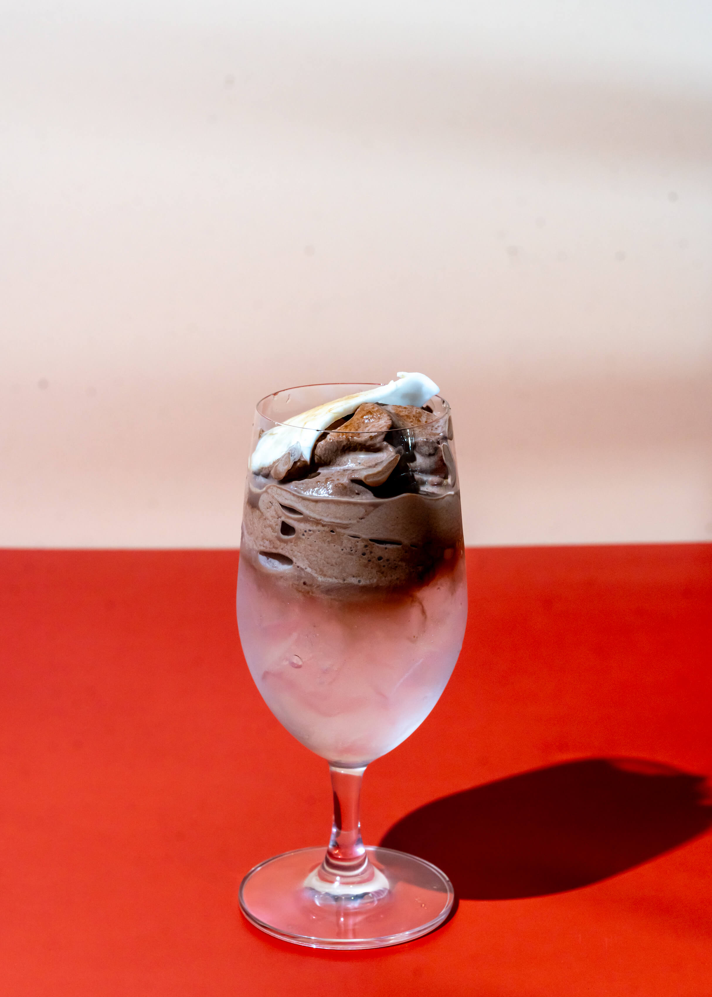 ใส่ไซรัปลงไปในแก้วและผสมน้ำมะพร้างลงไป