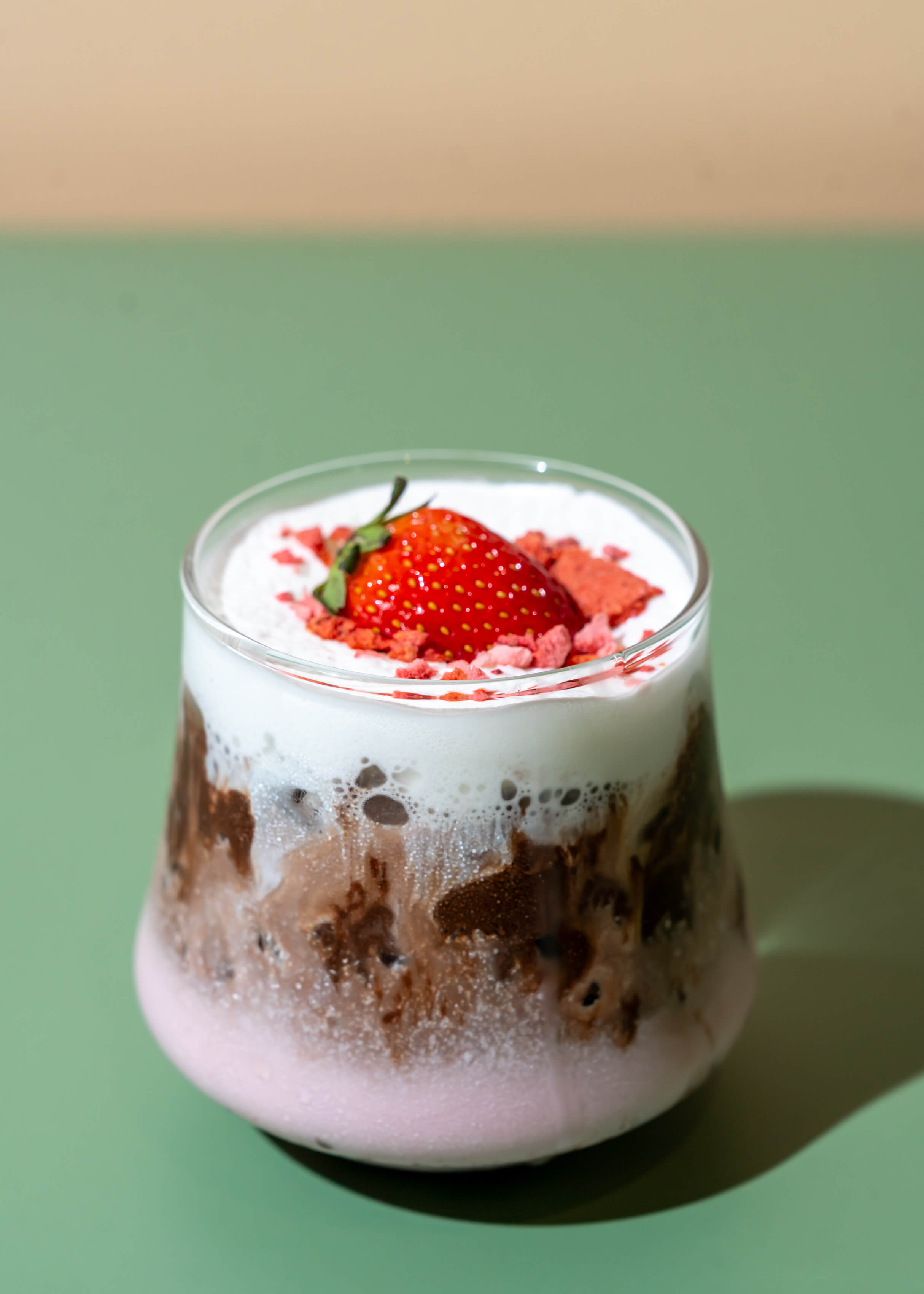 ท็อปด้วยมิลค์โฟม ตกแต่งด้วยสตรอเบอรี่ และโรยด้วยฟรีสดรายสตอเบอรี่